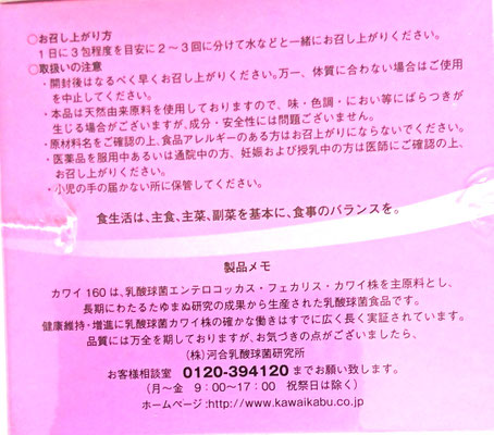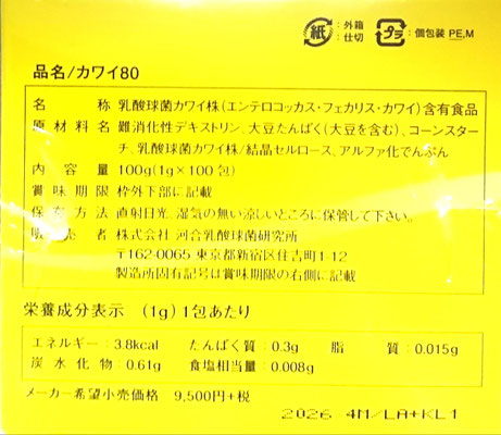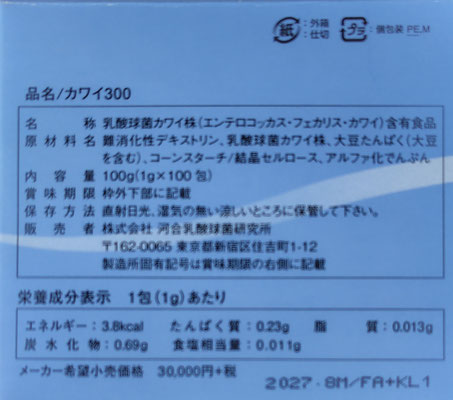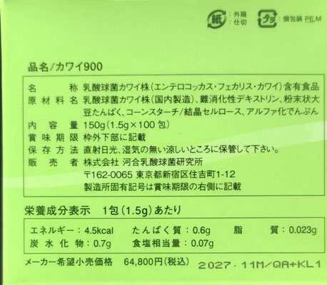 ◆原材料:乳酸球菌カワイ株、難消化性デキストリン、アルファー化でんぷん、 大豆たんぱく、コーンスターチ、 結晶セルロース